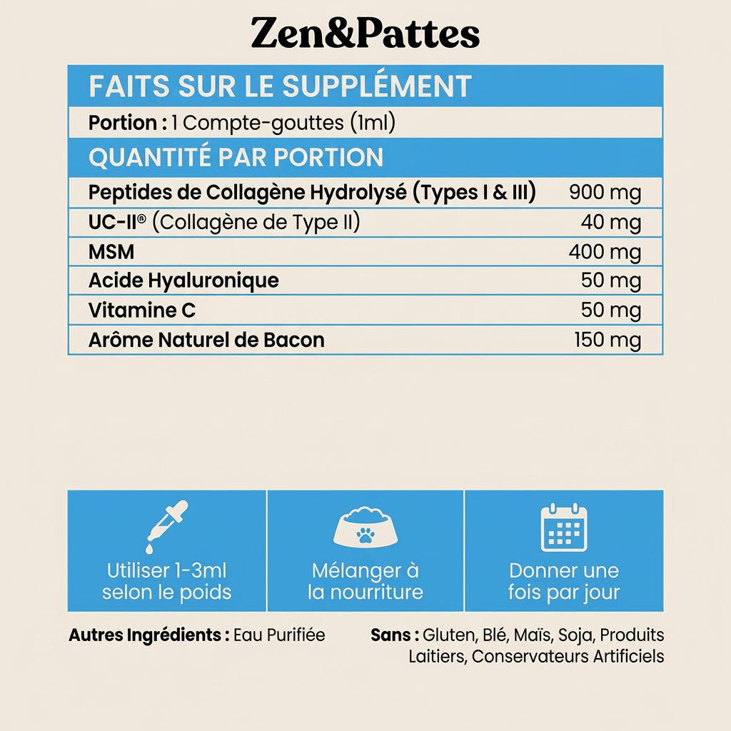 La peau de votre chien possède une barrière protectrice composée de collagène. Cette barrière empêche les allergènes de pénétrer en surface. Avec l'âge, les chiens perdent 7 à 10 % de leur collagène chaque année. Lorsque cette barrière se dégrade, les allergènes pénètrent en profondeur et déclenchent une réaction immunitaire : démangeaisons, irritations cutanées et otites. Notre collagène liquide apporte les éléments nécessaires à la reconstruction de cette barrière de l'intérieur.