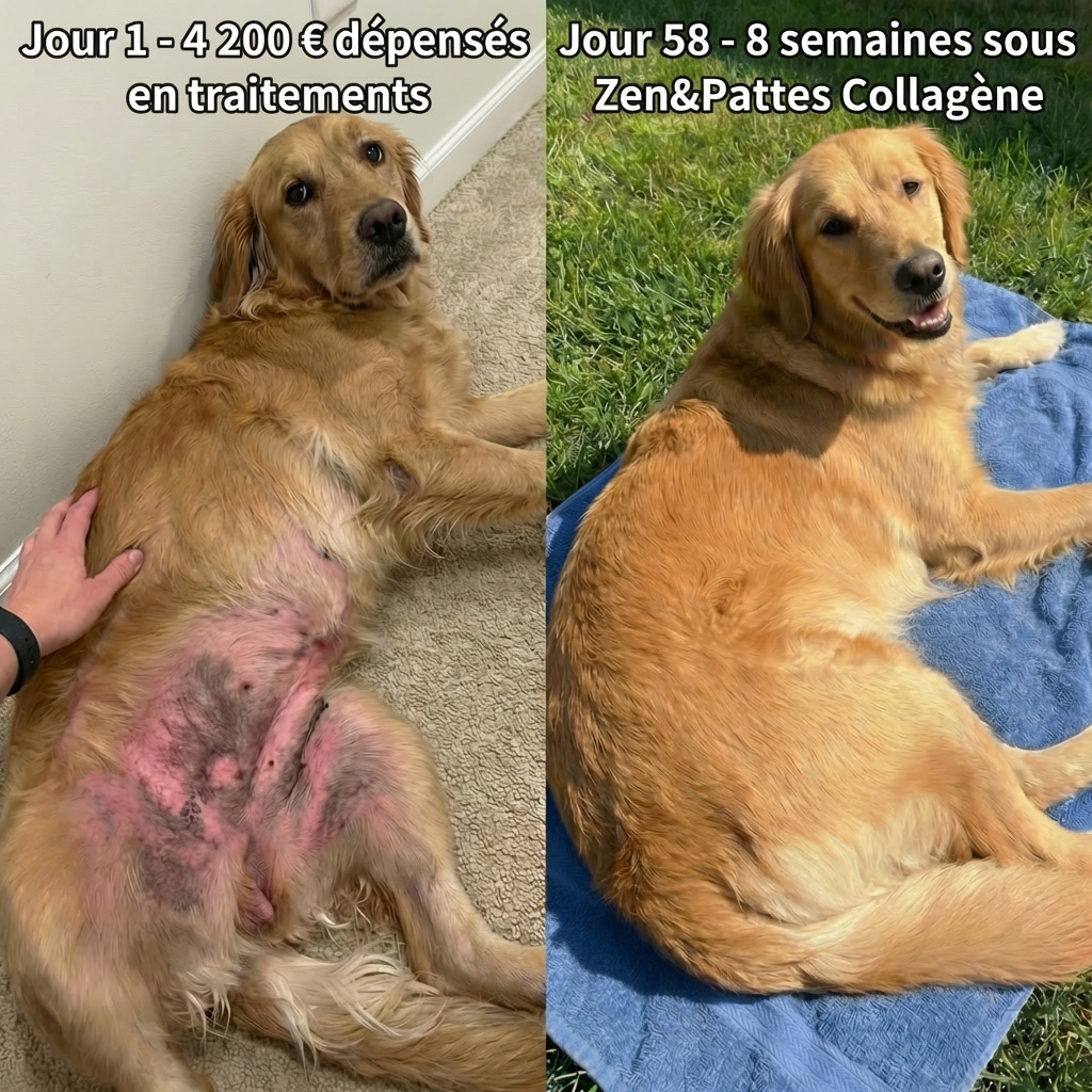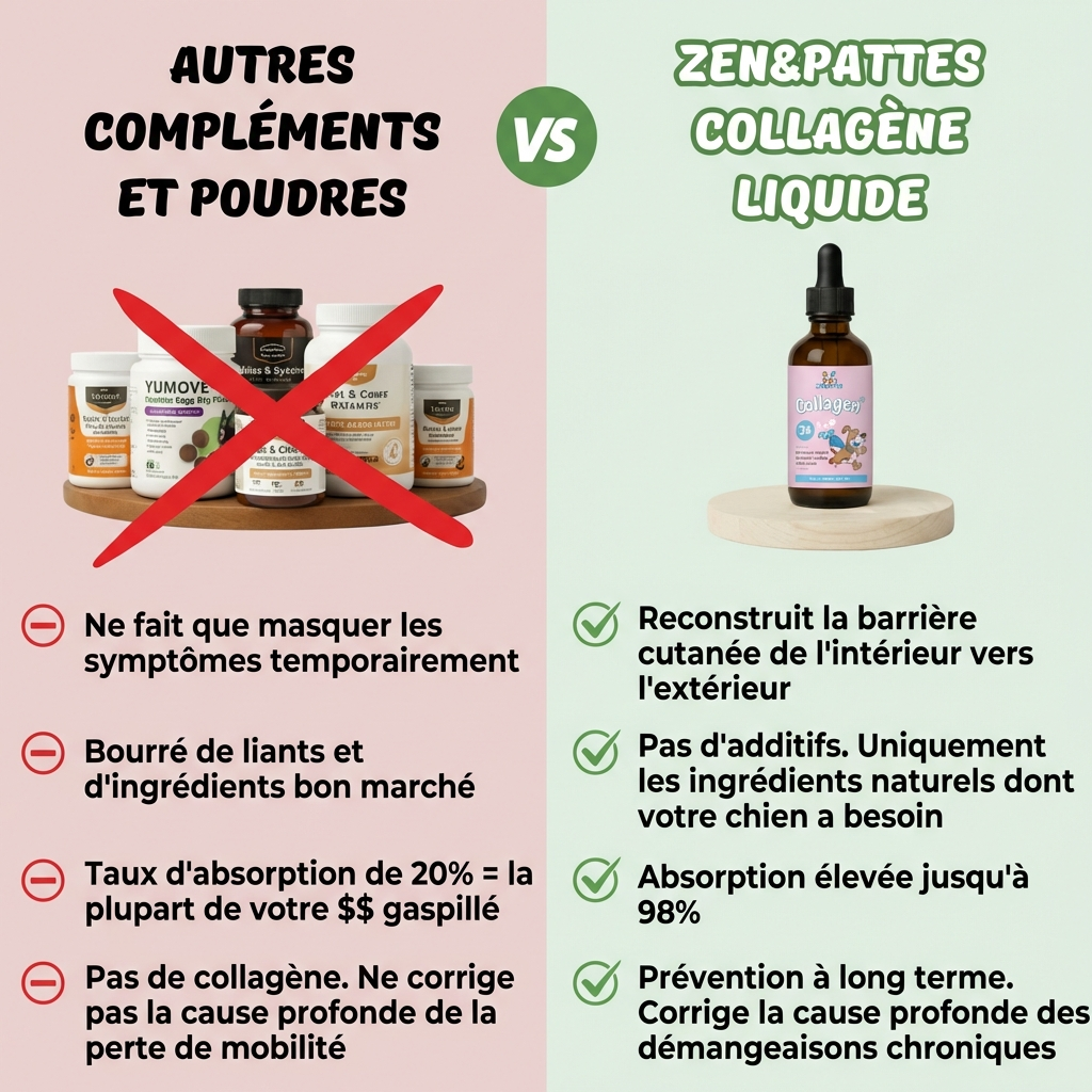 Aujourd'hui, plus de 50 000 chiens profitent des bienfaits d'une barrière cutanée renforcée grâce au collagène liquide Zen&Pattes : enfin débarrassés des démangeaisons chroniques, des points chauds et des otites. Car nous ne faisons pas que masquer les symptômes. Nous reconstruisons la structure de la peau.